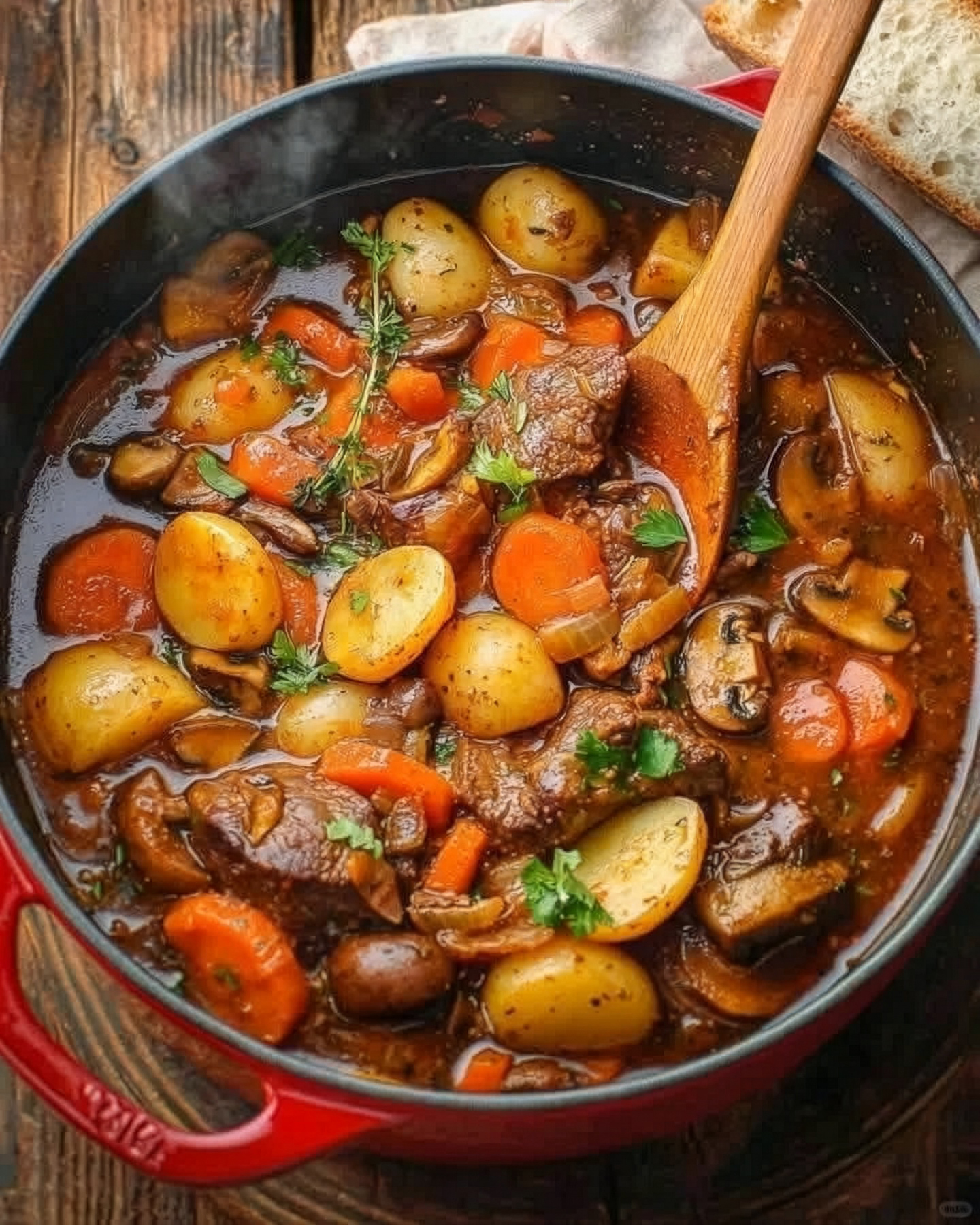 Ladle the rich, hearty stew into bowls and serve immediately with crusty bread for dipping. Enjoy the deep flavors, tender beef, and warm comfort โ and take a moment to savor the compliments. Youโve earned them.